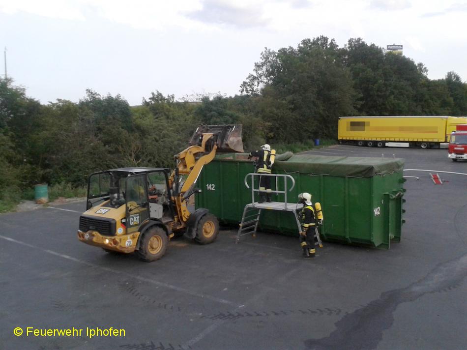 Die FF Iphofen stand zur Sicherung mit der Pulverlöschanlage bereit. Nach Kontrolle mit der Wärmebildkamera wurden unter schwerem Atemschutz die Plane vom Container gezogen und die Metallteile mithilfe des Radladers mit Sand bedeckt, um Glutnester zu ersticken. Nachdem durch diese Aktion keine erhöhte Brandgefahr mehr vom Container ausging, konnte die FF Iphofen die Einsatzstelle verlassen. Danke an die Kameraden/-innen aus Geiselwind für die seltene, aber angehme Zusammenarbeit!