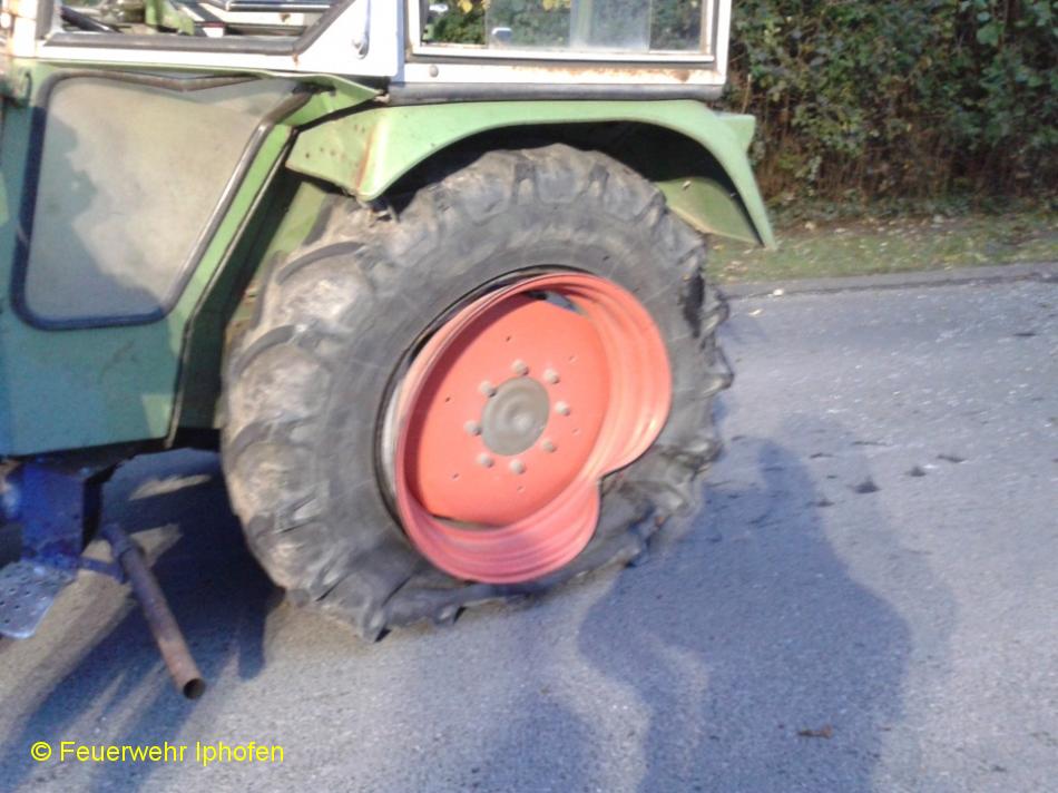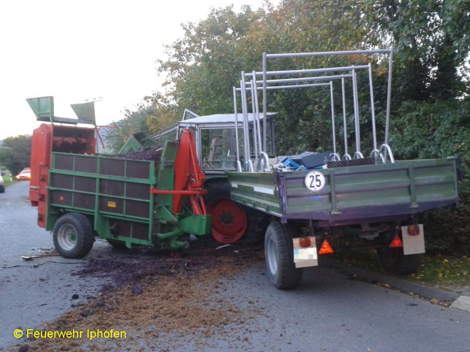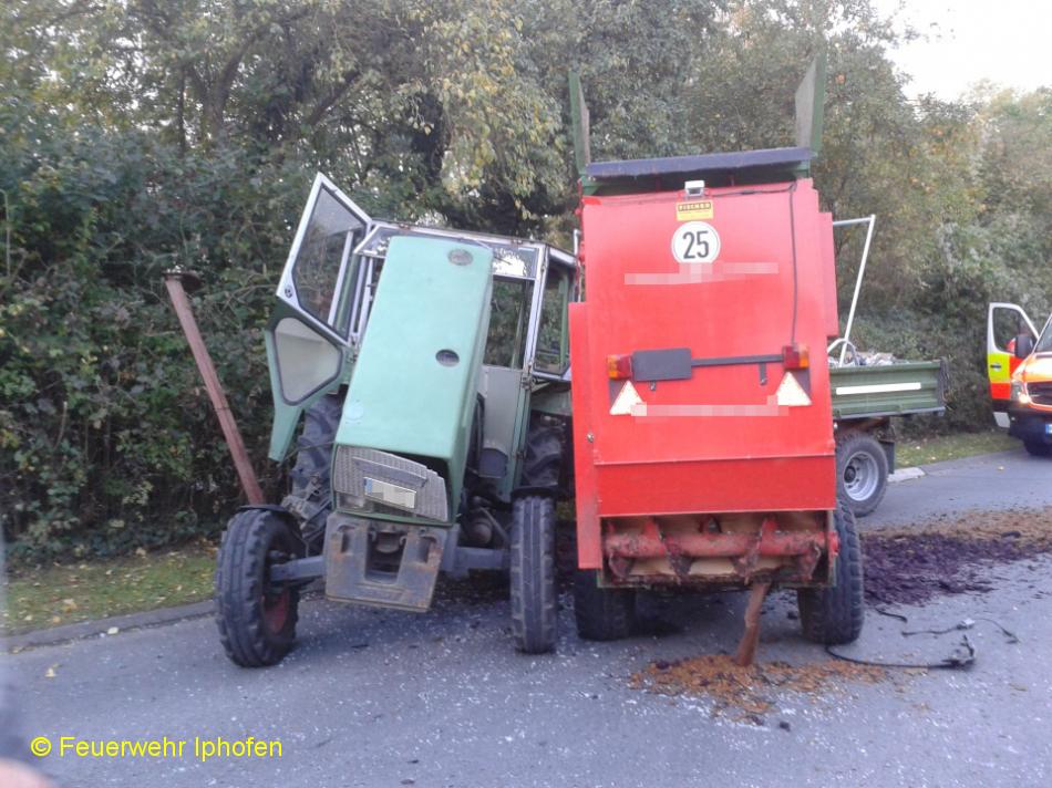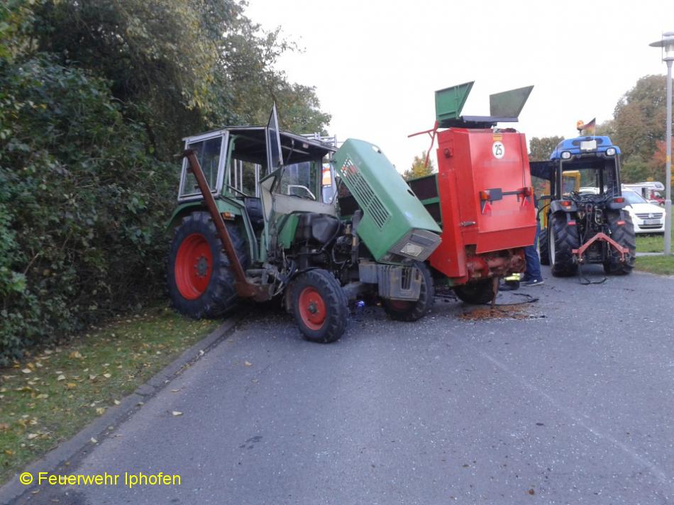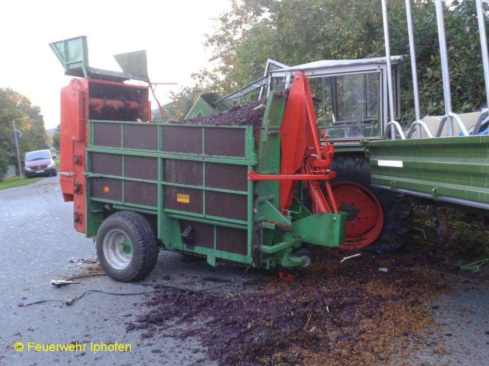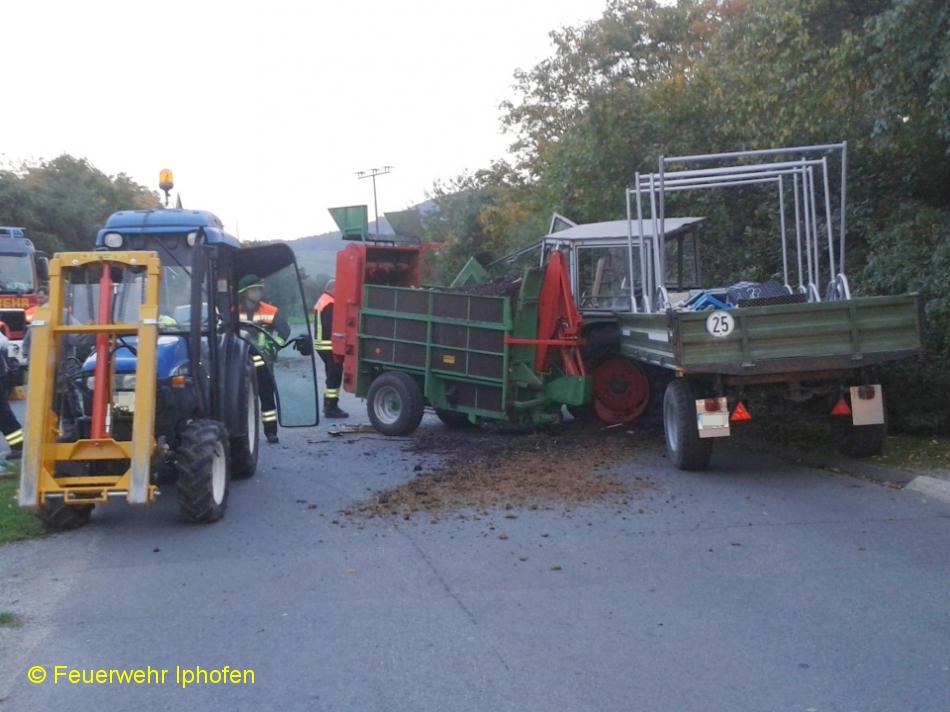 Einsatzbericht: "Verkehrsunfall mit zwei Schleppern in der Schützenstraße" lautete die Durchsage. Beim Eintreffen stellte sich heraus, dass ein mit Trester beladener Miststreuer auf ein entgegenkommendes Gespann geprallt war. Das Zugfahrzeug stand daneben. Der Fahrer des getroffenen Schleppers befand sich noch in seiner Kabine. Zusammen mit dem Rettungsdienst und dem HvO halfen wir dem Mann beim Aussteigen. Er und ein Mitfahrer wurden rettungsdienstlich versorgt und in ein Krankenhaus gebracht. Mithilfe eines hinzugerufenen Schleppers wurde die Unfallstelle geräumt. Die Straße war für rund eineinhalb Stunden total gesperrt.