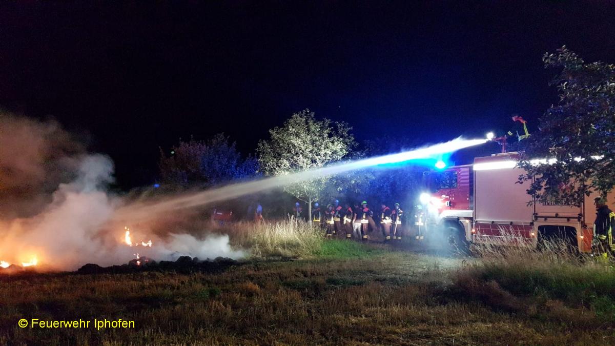 Einsatzbericht: "Brand von zwei bis drei Strohballen" lautete die Alarmmeldung am späten Montagabend. Beim Eintreffen der Feuerwehren aus Markt Einersheim und Iphofen stand bereits der gesamte Strohhaufen, bestehend aus 22 Rundballen, im Vollbrand. Nachdem ein Auseinanderziehen mithilfe eines Frontladers aufgrund der großen Hitze scheiterte, wurde ein Teleskoplader organisiert, der die brennenden Ballen zerteilte. Noch vorhandene Gluthaufen wurden mit dem Werfer unseres neuen TLF 3000 abgelöscht, bevor der Eigentümer des Ackers letzte Reste in den Boden einackerte und so das Feuer entgültig erstickte.