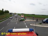 Einsatzbericht: Zur Verkehrssicherung nach einen Unfall wurde die FF Iphofen am Montagmittag auf die B8, Einmündung Westumgehung, gerufen. Dort waren ein PKW und ein Wohnmobil kollidiert. Beim Eintreffen befanden sich alle beteilten Personen bereits ausßerhalb ihrer Fahrzeuge. Da die B8 stark befahren ist und die Unfallstelle im Kreuzungsbereich die Fahrbahn blockierte, lenkte die Feuerwehr den Verkehr und band auslaufende Betriebsstoffe ab.