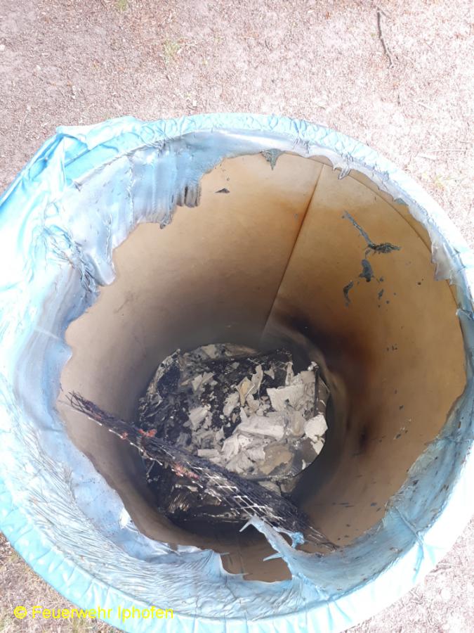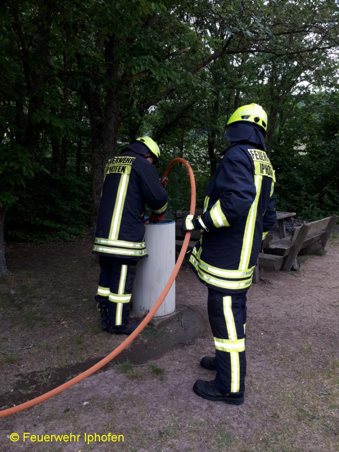 Einsatzbericht: Einsatz Nr. 4 an diesem Tag: Noch während des in Gnötzheim laufenden Einsatzes wurden wir von der ILS per Funk zu einem brennenden Mülleimer zum Spielplatz am Ringsbühl alarmiert. Offensichtlich hatte jemand noch heiße Grillkohle in der Mülltonne entsorgt. Mit dem am Standort verbliebenen HLF rückten wir aus und löschten das Brandgut ab.