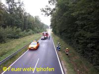 Einsatzbericht: Ein Verkehrsunfall mit zwei PKW ereignete sich am Sonntagnachmittag auf der B286 zwischen Birklingen und Castell. Beim Eintreffen war der Rettungsdienst schon vor Ort, der Fahrer des einen Wagens und die drei Mitfahrer des anderen Autos hatten bereits ihre Fahrzeuge verlassen und wurden vom Rettungsdienst versorgt. Der Fahrer des zweiten PKWs konnte schließlich ohne Einsatz von hydraulischem Rettungsgerät befreit werden. Für die Dauer der Rettungsarbeiten wurde die B286 durch die Feuerwehren aus Birklingen, Iphofen und Castell vollständig gesperrt.