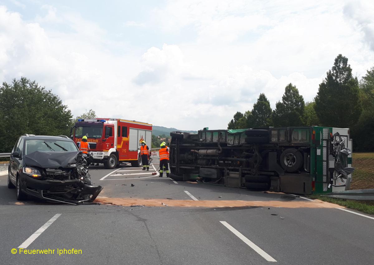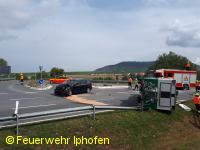 Einsatzbericht: "Verkehrsunfall mit PKW auf der B8", so lautete die Meldung für den heutigen Einsatz. Beim Eintreffen fanden wir einen PKW und ein Wohnmobil vor, das auf der Beifahrerseite lag. Um die Einsatzstelle abzusichern, Betriebstoffe aufzunehmen und den Brandschutz sicherzustellen, wurde Vollalarm für Iphofen und Mainbernheim ausgelöst. Die Bundesstraße war über den gesamten Zeitraum komplett gesperrt, der Verkehr wurde großräumig umgeleitet.