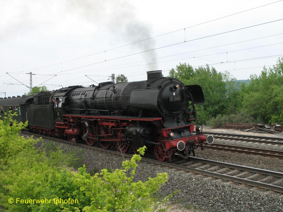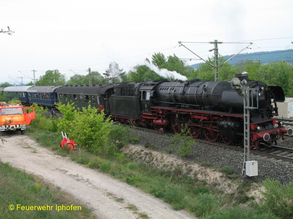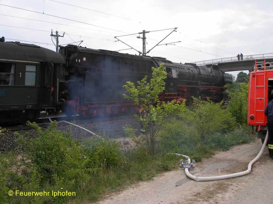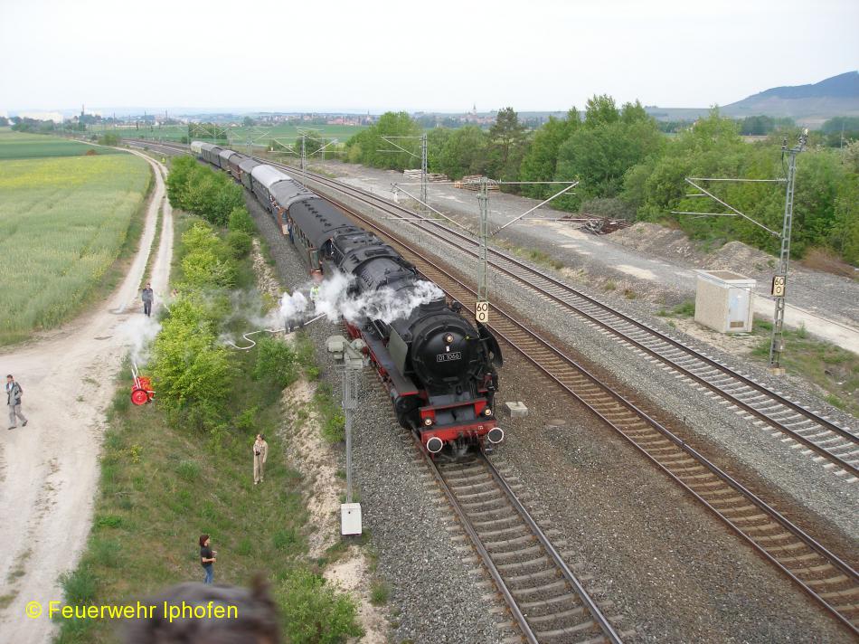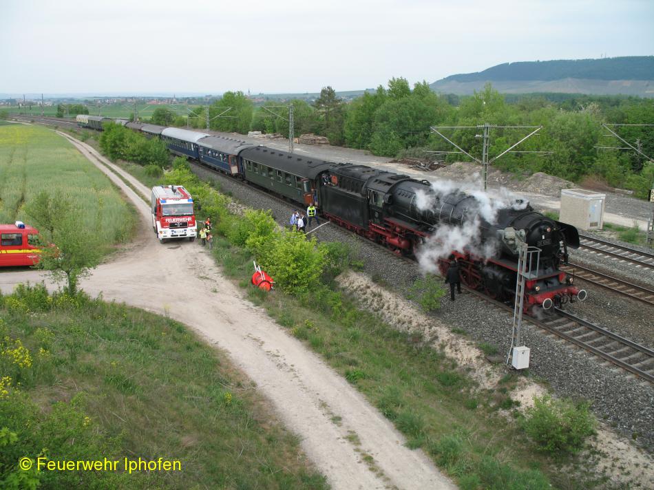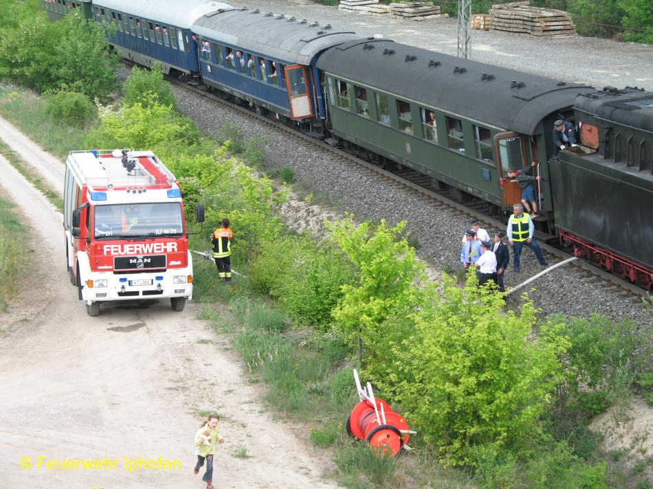 Einsatzbericht: Ein historischer Dampfschnellzug benötigte auf der Fahrt von Stuttgart nach Regensburg Wasser zur Weiterfahrt. Deshalb fand ein geplanter Halt auf der Bahnstrecke Würzburg-Nürnberg auf einem Seitengleis kurz vor Markt Einersheim statt. Mit drei Löschfahrzeugen füllten wir den Tank mit 26500 Litern Wasser. Das Wasser wurde an einem nahen Hydranten getankt.