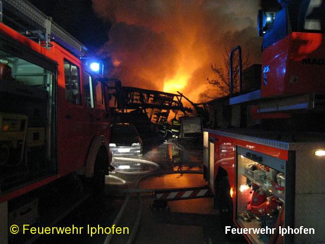 Einsatzbericht: Am frühen Neujahrsmorgen, gegen 03.20 Uhr, brach in einem Zimmereibetrieb am Stadtrand von Kitzingen ein Brand aus. Ein eingeschossiges Gebäude und eine angebaute Lagerhalle einer Baufirma wurden dabei teils vollkommen zerstört. Bei Temperaturen deutlich unter den Gefrierpunkt und der engen Bebauung um den Brandherd stellten sich die Löscharbeiten als sehr schwierig dar. Einige unmittelbare Nachbarn verließen während der Brandbekämpfungsmaßnahmen ihre Wohnungen. Durch massives Eingreifen mehrerer Feuerwehren konnte ein Übergreifen der Flammen auf Nachbarwohngebäude verhindert werden. Der Einsatzort wurde großräumig abgesperrt. Durch gefrorenes Löschwasser bildeten sich rund um die Einsatzstelle und angrenzenden Straßen teils große Eisflächen. Teile der Löschmannschaften und Einsatzgerät waren durch auftretenden Wassernebel buchstäblich vereist. Sechs Feuerwehrangehörige erlitten im Einsatz Frakturen, Schnitt- und Sturzverletzungen, Prellungen, Bänderdehnungen und leichtere Verbrennungen. Sie wurden von einem Notarzt und von den Besatzungen mehrerer Rettungsfahrzeuge ärztlich versorgt. Trotzdem mussten zwei Feuerwehrangehörige ambulant eine Klink aufsuchen. Das BRK stellte mehrere beheizbare Zelte auf und versorgte die Einsatzkräfte mit heißen Getränken. Die Kriminalpolizei hat noch in der Nacht wegen der ungeklärten Brandursache Ermittlungen aufgenommen. Im Großeinsatz waren die Stadtfeuerwehr Kitzingen, alle Stadtteilfeuerwehren aus Repperndorf, Hohenfeld, Hoheim und Sickershausen, dazu die Freiwilligen Feuerwehren aus Iphofen, Albertshofen und Mainstockheim sowie die Werkfeuerwehr Fehrer mit rund 160 Einsatzkräften. Neben der Polizei stellte das BRK Kitzingen noch knapp 50 Helfer. Nach Polizeiangaben soll sich die Schadenssumme auf rund 250.000 EURO belaufen. Die Einsatzdauer belief sich mit einer Brandnachschau am Nachmittag auf über neun Stunden.