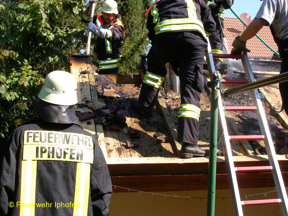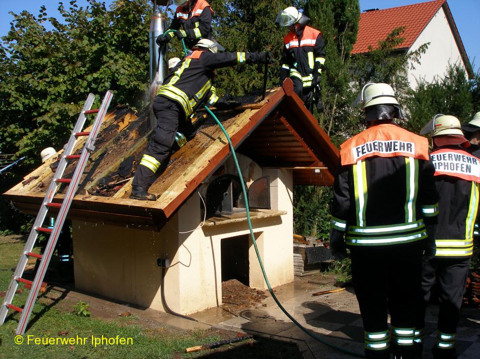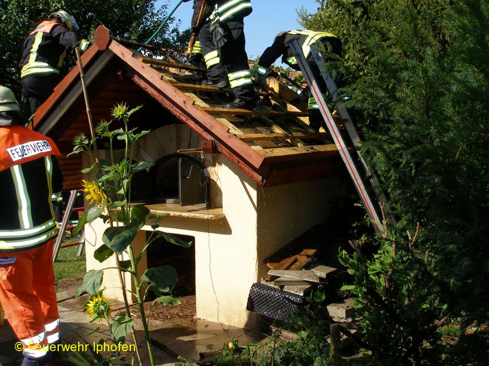 Einsatzbericht: Ein Raub der Flammen wurde am Dienstag Vormittag ein privates Backhaus in der Iphöfer Siedlung. Beim Eintreffen der Einsatzkräfte drang starker Rauch unter den Ziegeln hervor. Daraufhin wurden das Dach abgedeckt und der brennende Dachstuhl des freistehenden Häuschens abgelöscht. Verletzt wurde niemand.