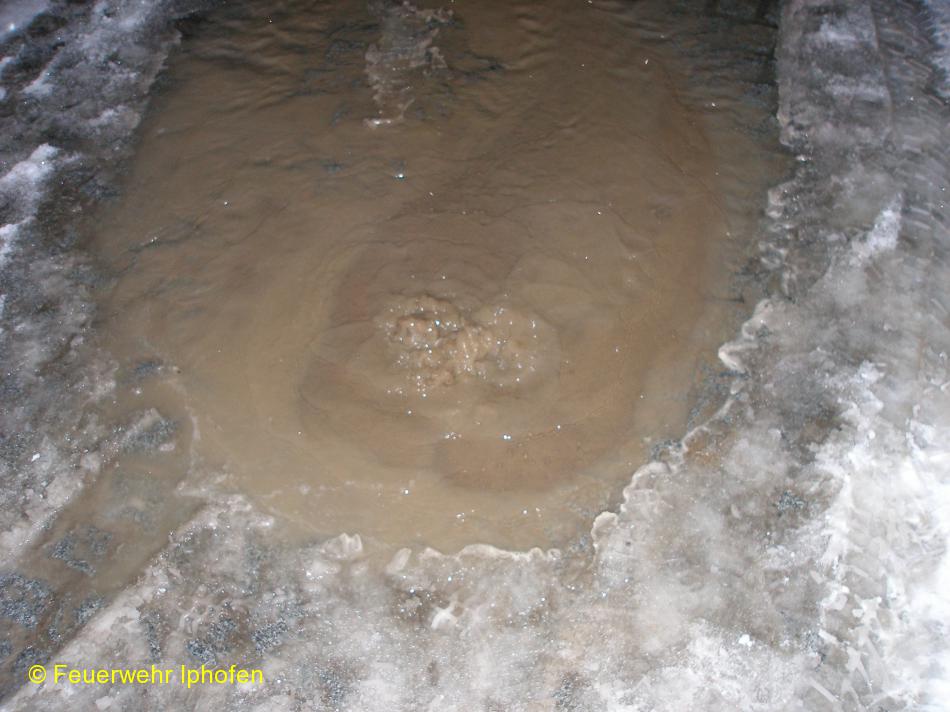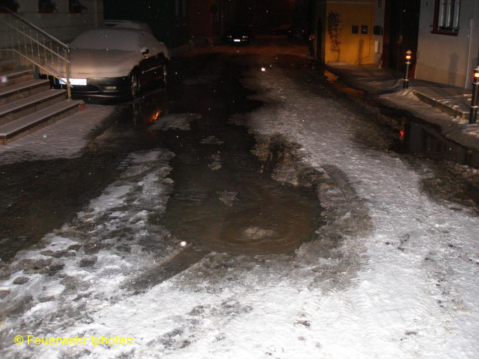 Einsatzbericht: Bei -8°C ereignete sich ein Wasserrohrbruch auf der Straße. Da die Straße komplett vereist war, mussten die Wasserschieber anhand der Hinweisschilder und Pläne gesucht werden. Zusammen mit dem städtischen Bauhof wurde der betroffene Leitungsstrang abgeschiebert. Der Bauhof reparierte das Leck noch in der Nacht.