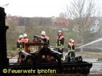Übungsbericht: Mit 25 Feuerwehrleuten rückte die Feuerwehr Iphofen zu einer Übung auf ein landwirtschaftlichen Anwesen im Ortsteil Hellmitzheim aus. Gemeinsam mit der Feuerwehr Hellmitzheim wurde ein Löschangriff von innen und außen durchgeführt. Während die Hellmitzheimer Kameraden den Erstangriff vom Norden her auf die "brennende" Unterstellhalle durchführten, übernahmen die nachrückenden Iphöfer den Angriff vom Süden her mit Drehleiter und Innenangriff. Die angrenzenden Gebäude wurden durch Riegelstellungen geschützt.