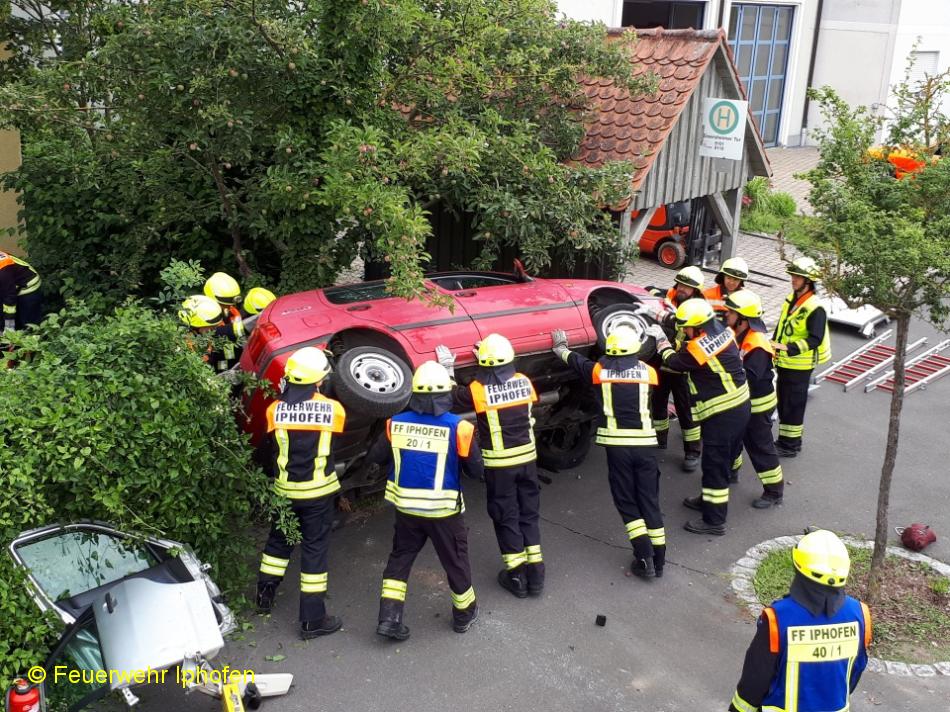 Insgesamt befanden sich drei "Verletzte" in den beiden Autos. Nach Stabilisierung der PKWs wurde mit der Rettung begonnen: Ein Kind konnte schnell durch die Heckscheibe befreit werden, der Unfallverursacher wurde schonend gerettet, während die während des Einsatzes plötzlich kollabierende PKW-Fahrerin mittels Crash-Rettung befreit werden musste. Die Anordnung der Unfallfahrzeuge, die teilweise schlechte Zugänglichkeit auf Privatgrund und die sich wechselnden Gesundheitszustände der "verunfallten" Personen forderten Führung und Mannschaft. Danke, dass so viele an der Übung teilgenommen haben (trotz Johannisfeuer am Vorabend ;-))!