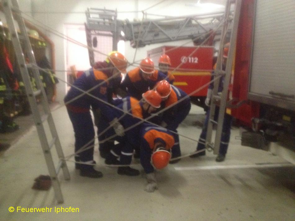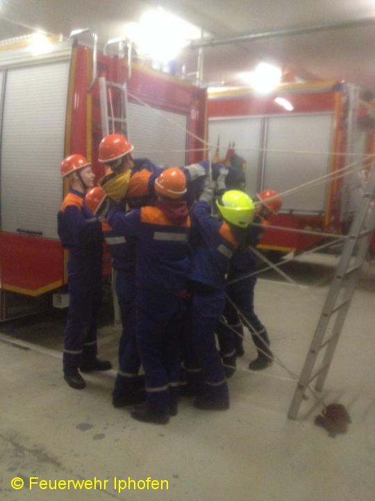 Alle Jugendliche müssen durch ein Netz aus Feuerwehrleinen hindurch, wobei jedes Loch nur einmal benutzt werden darf.