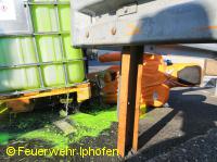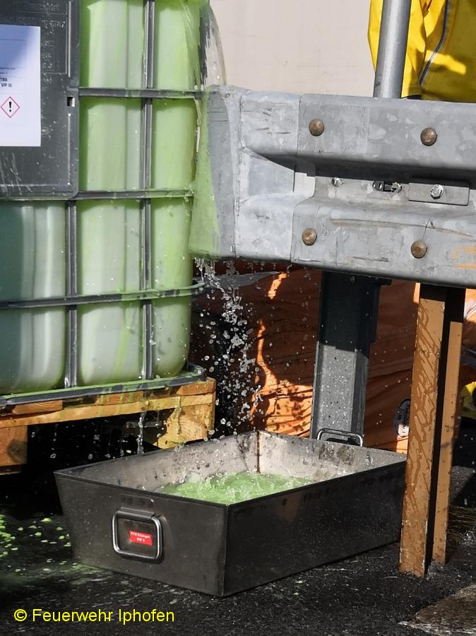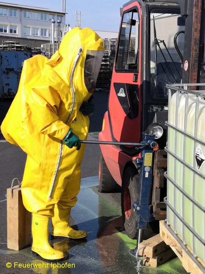 Übungsbericht: Scheinbar einfach und realistisch, mit den Tücken im Detail, so war die diesjährige Abschlussübung des 1. Löschzuges Gefahrgut, bestehend aus den Feuerwehren Kitzingen, Sickershausen und Iphofen, inszeniert. Ein Gabelstapler mit bewusstlosem Fahrer, auf der Gabel ein Behälter mit 1000l giftgrüner Flüssigkeit, die heraustropfte, unter dem Behälter eine Person auf einem Fahrrad, so stellte sich die Ausgangslage dar. Zügig mussten die Kräfte eingeteilt werden, eine Notdekontamination errichtet werden und der Fahrer in Crashrettung unter schwerem Atemschutz vom Stapler geholt werden. Außerdem wurden der auslaufende Stoff und sein Gefahrenpotential ermittelt, die Dekontaminationsdusche aufgebaut, der Brandschutz sichergestellt, die Einsatzstelle unter CSA (Chemikalienschutzanzug) ausführlich erkundet sowie die Flüssigkeit aufgefangen. Nicht alltäglich lief schließlich die Rettung des Radfahrers ab, unter CSA mit hydraulischen Geräten zu arbeiten, ist alles andere als einfach, zeigte aber Erfolg, der Radler konnte befreit werden.