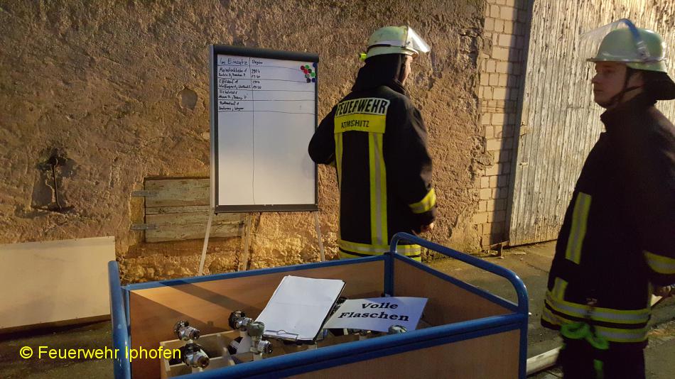 Einsatzbericht: Die Atemschutzwerkstatt des Landkreises Kitzingen übernahm bei einem Scheunenbrand in der Ortsmitte von Effeldorf die Koordination und Überwachung der Atemschutztrupps sowie die Sicherstellung der Versorgung mit Atemlutftflaschen.