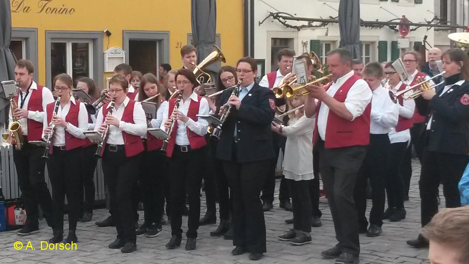 Einsatzbericht: Der Maibaum steht wieder! Wie jedes Jahr wurde er von der Feuerwehrjugend geschmückt. Anschließend wurde er - begleitet von der Winzertanzgruppe Iphofen, unserem Musikzug und der Feuerwehr - zum Marktplatz gebracht, wo er traditionell mit Muskelkraft aufgestellt wurde. Zahlreiche Zuschauer wohnten dem Spektakel bei und applaudierten, als der Baum stand.
