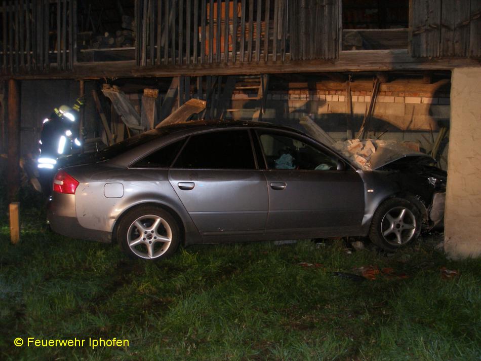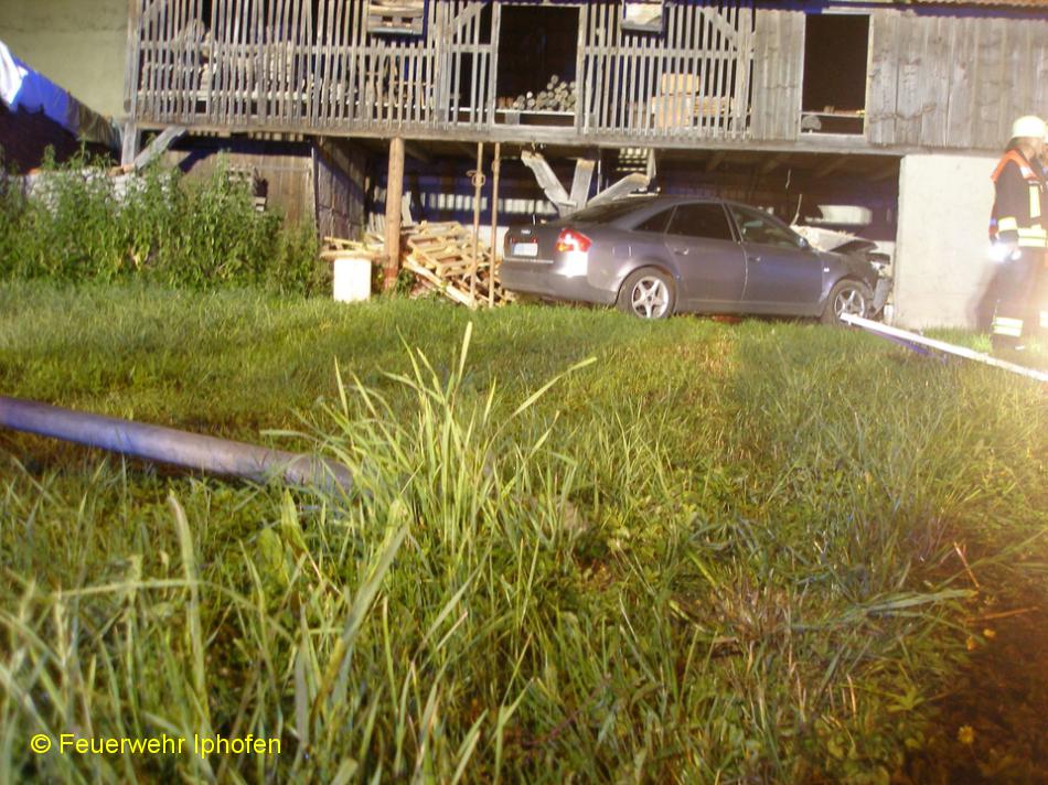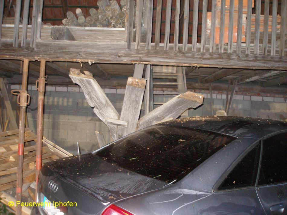 Einsatzbericht: Spektakulär klang die Meldung "PKW in Gebäude, vermutlich Person eingeklemmt". Bis zum Eintreffen der Feuerwehren aus Birklingen, Iphofen und Castell war der Fahrer bereits selbstständig aus dem Auto gestiegen und von Anwohnern betreut worden. Im Unfallwagen befanden sich keine weiteren Personen. Der PKW stand beschädigt in einer offenen Halle, beim "Einparken" war unter anderem ein Stützbalken beschädigt worden. Zusammen mit den Kameraden aus Birklingen wurden zwei Sprieße zur Stabilisierung des Schuppens gesetzt. Sechs Kameraden der Löschgruppe Birklingen banden auslaufende Kraftstoffe und sicherten die Unfallstelle bis zur Bergung des Fahrzeugs durch ein Abschleppunternehmen. Um 2:08 Uhr konnten auch sie schließlich die Einsatzstelle verlassen.