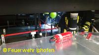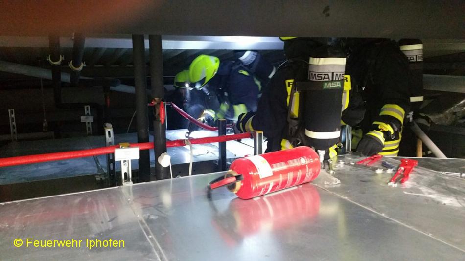 Einsatzbericht: Auslösen eines Rauchmelders in einem Bürogebäude. Bereits beim Eintreffen wurde vom betrieblichen Sicherheitspersonal Schmorgeruch in einem Konferenzraum gemeldet. Leichte Rauchentwicklung, die sichtbar zunahm, war dort feststellbar. Bei Kontrolle der Lüftungsanlage im oberhalb gelegenen Technikraum zeigten sich Rauch und offene Flammen durch einen Dichtungsschlitz. Die Lüftung wurde abgeschaltet, das Feuer gelöscht, die Ausbreitung im Lüftungsschacht mit der Wärmebildkamera lokalisiert und anschließend der betroffene Teil der Lüftungsanlage geöffnet. Nach rund zwei Stunden konnte das Gebäude wieder dem Betreiber übergeben werden.
