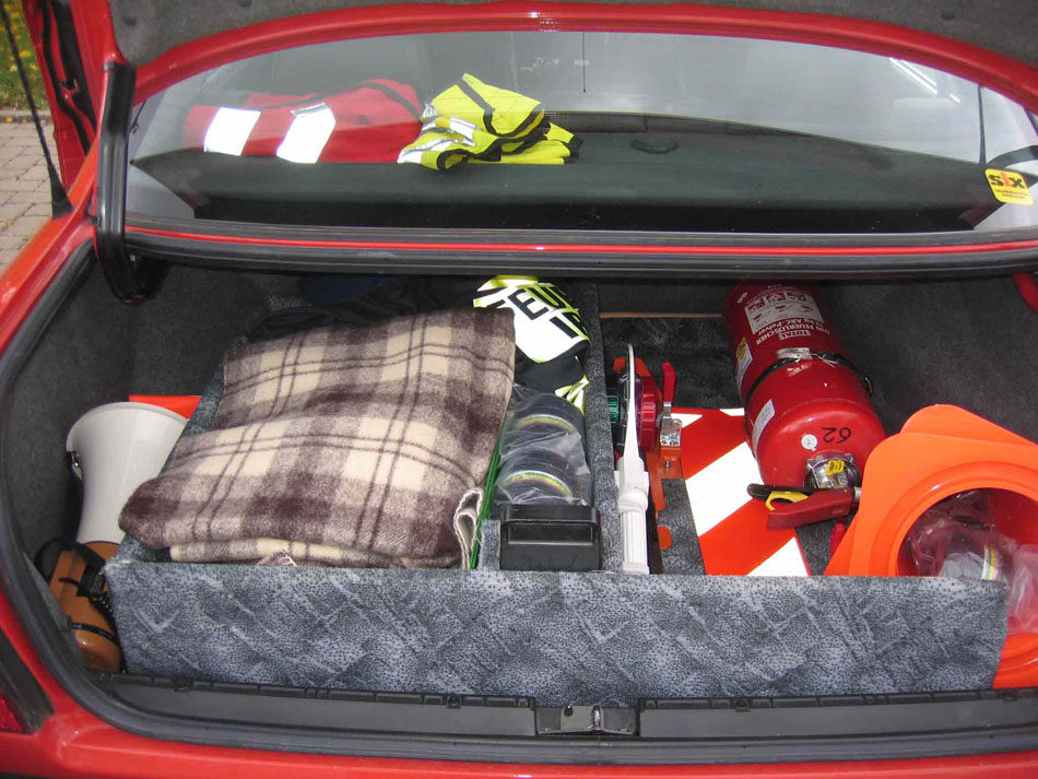 Beladung: Pulverlöscher, Verkehrsabsicherung, Megaphone, Decken, etc.