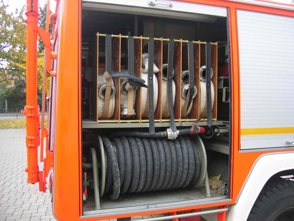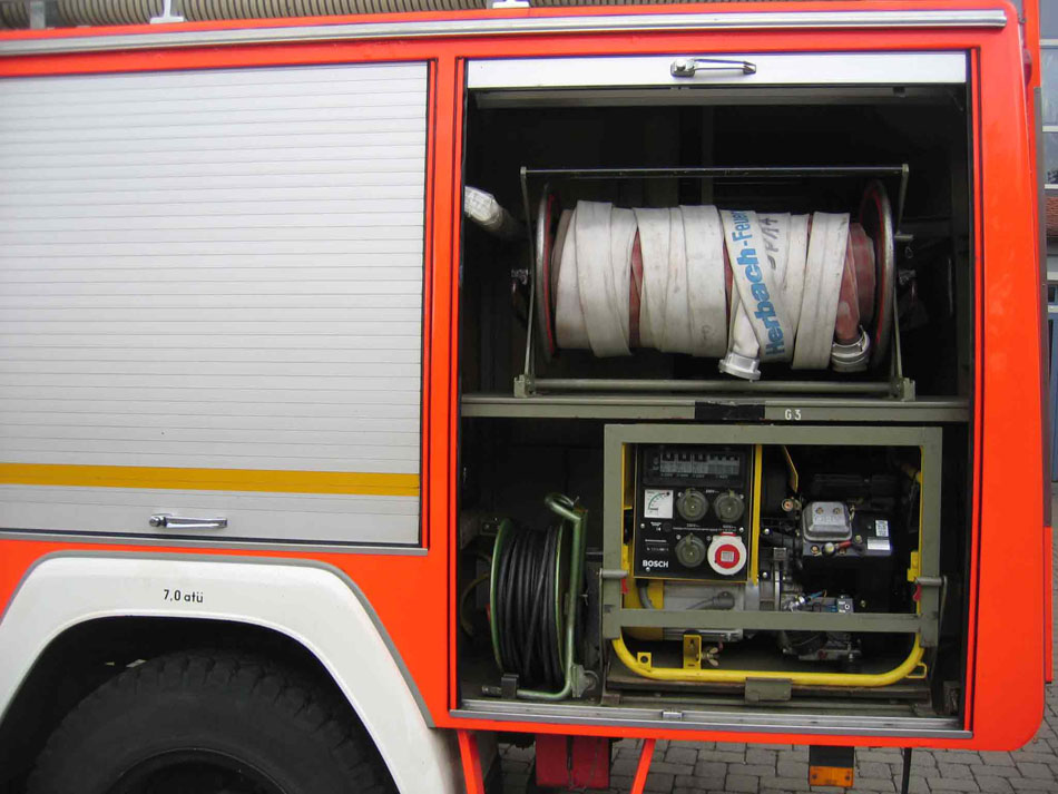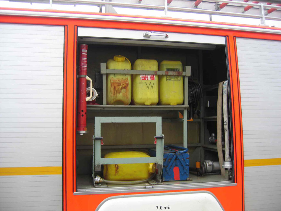 Beladung: 100 Liter Schaummittel, 4 x Atemschutzgeräte, 5 kVA Stromerzeuger, Drucklüfter, Hydraulischer Rettungssatz